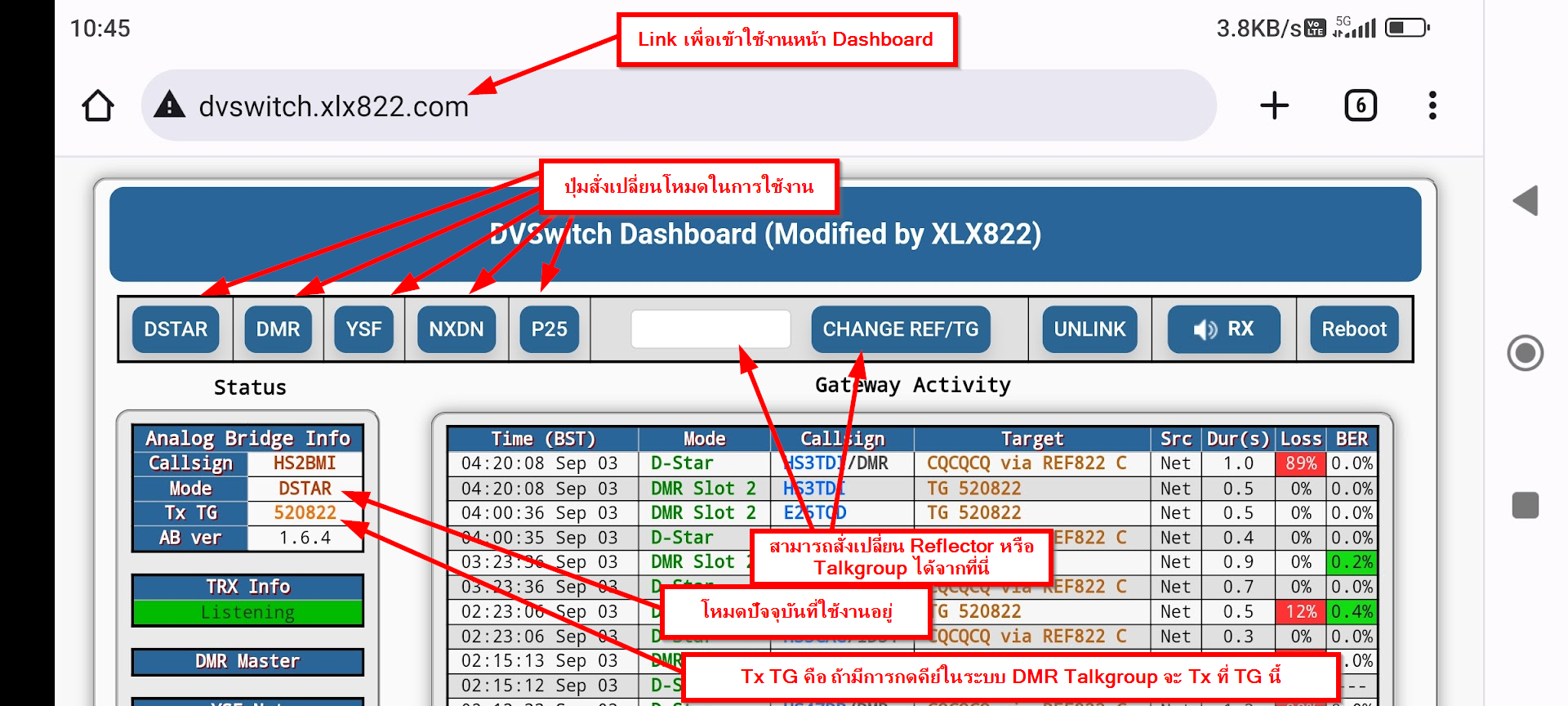 ความพิเศษของ DVSwitch Server ของ XLX822 คือจะมีหน้า Dashboard ที่สามารถเปลี่ยนโหมด หรือ เปลี่ยน Talkgroup/Reflector ได้ด้วย