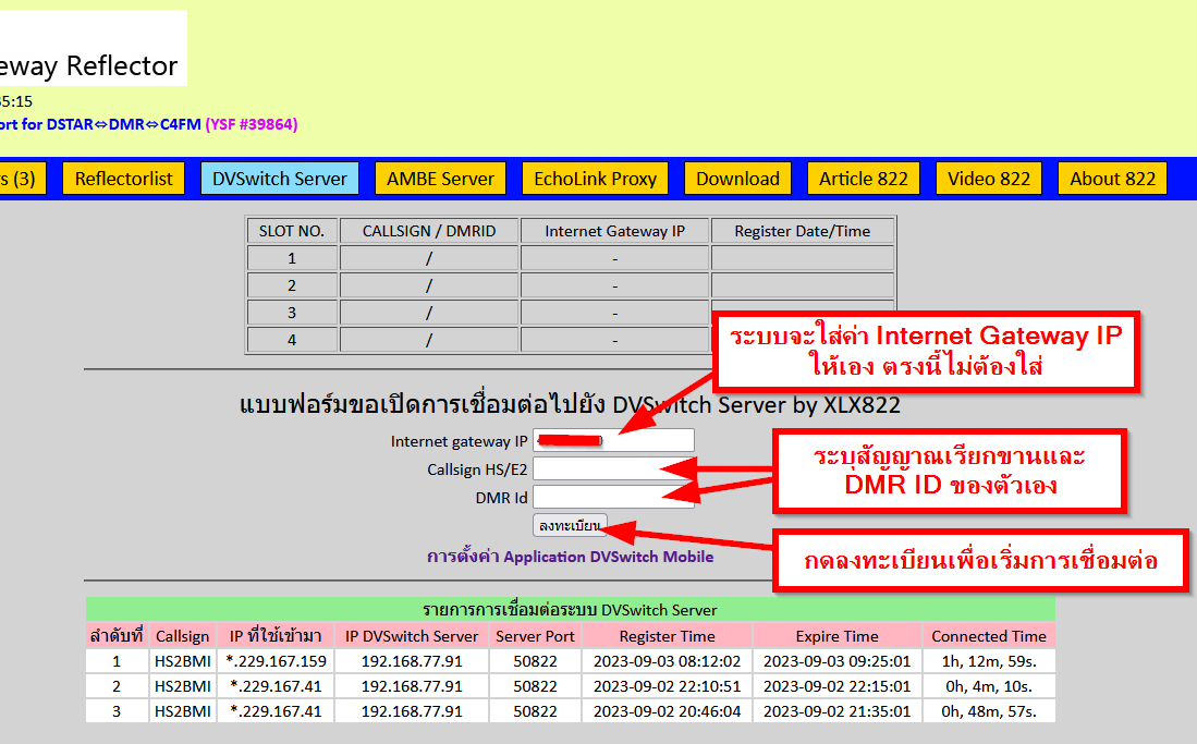 หลังจากบันทึกการตั้งค่าแล้วให้ออกจาก Application แล้วไปทำการกรอกแบบฟอร์มขอเชื่อมต่อที่หน้า DVSwitch Server ของ XLX822