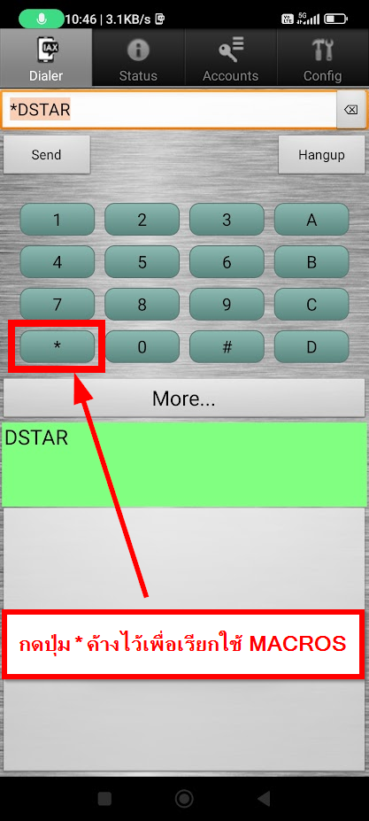 หลังจากเพิ่มค่าต่าง ๆ ไว้ที่ MACROS แล้ว วิธีการใช้งานก็ให้กลับมาที่หน้า Dialer แล้วกดปุ่ม * ค้างไว้ เพื่อเลือก MACROS ที่เราได้เพิ่มไว้